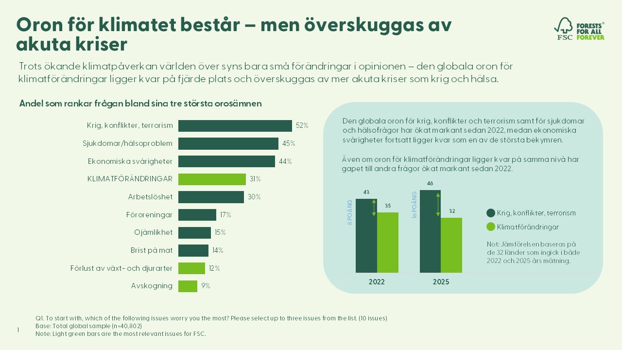 Trots minskad oro för klimatförändringar är frågor som avskogning, förlust av arter, skogsbränder och torka fortsatt bland de mest akuta miljöproblemen globalt. Enligt FSC visar det att människor upplever klimatförändringar tydligast genom vad som händer i skogarna – där konsekvenserna blir konkreta.